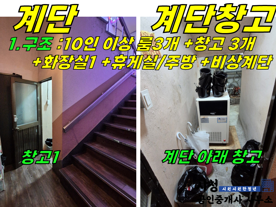 ■구조 :룸3(10명 이상 가능) +대기실/주방 +카운터 +창고3(입구 앞 계단, 홀 내, 비상계단 옆) +화장실 등