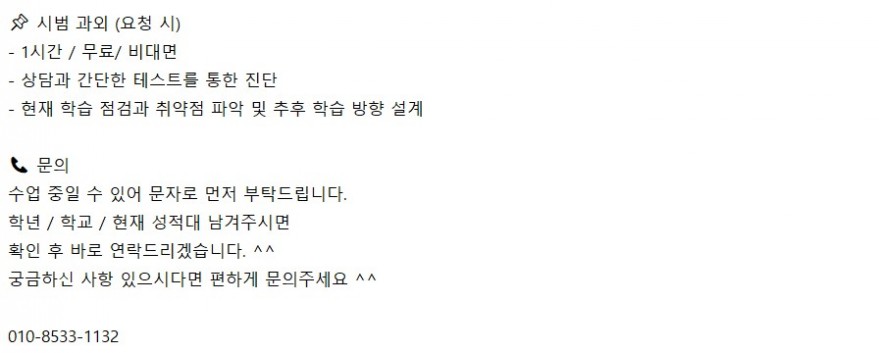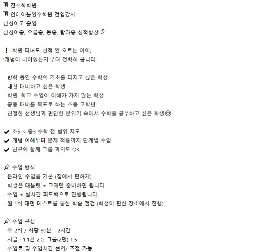 중등수학전문과외(시범과외무료) 페이지 정보 작성자 hOOOOOOOl 작성일26-01-06 18:17 조회1,394회 연락처 010-0000-0000 관련링크 본문 . 이전글 다음글 목록
