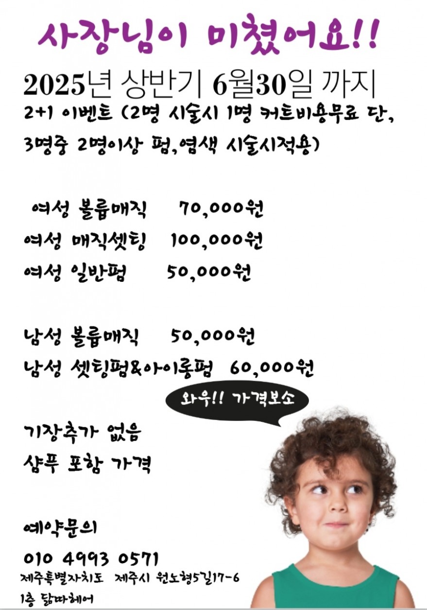 제주 노형동 가성비 미용실 닮따헤어 빅 이벤트 페이지 정보 작성자 닮OO어 작성일25-03-19 12:39 조회6,697회 연락처 010-4993-0571 관련링크 본문 이전글 다음글 목록