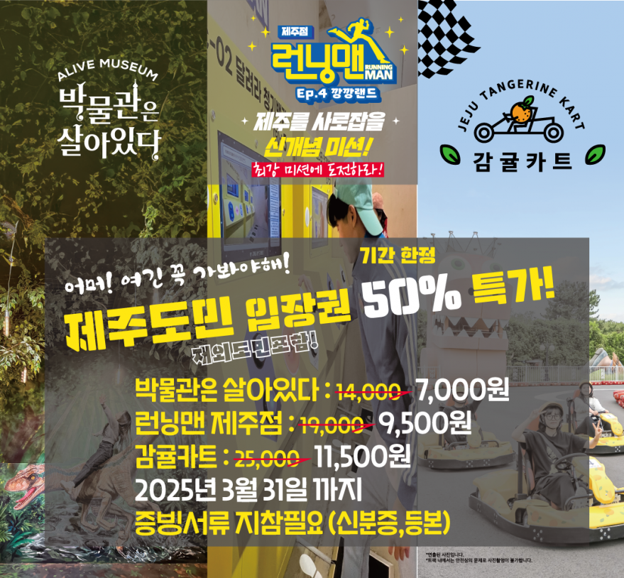 제주 중문점 박물관,감귤카트,런닝맨 체험관 도민할인 이벤트 페이지 정보 작성자 런O맨 작성일25-02-11 16:31 조회6,569회 연락처 010-1234-5678 관련링크 본문 제주도민 기간 한정 50% 특가 이전글 다음글 목록