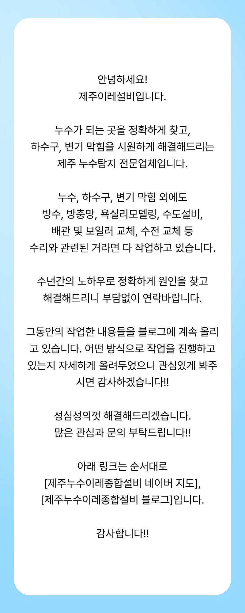 제주이레설비입니다. 페이지 정보 작성자 제OOOO비 작성일25-12-16 20:23 조회1회 연락처 010-3955-7946 관련링크 본문 안녕하세요!제주이레설비입니다. naver.me/Gn0SEyoh blog.naver.com/jeju_jireh 다음글 목록